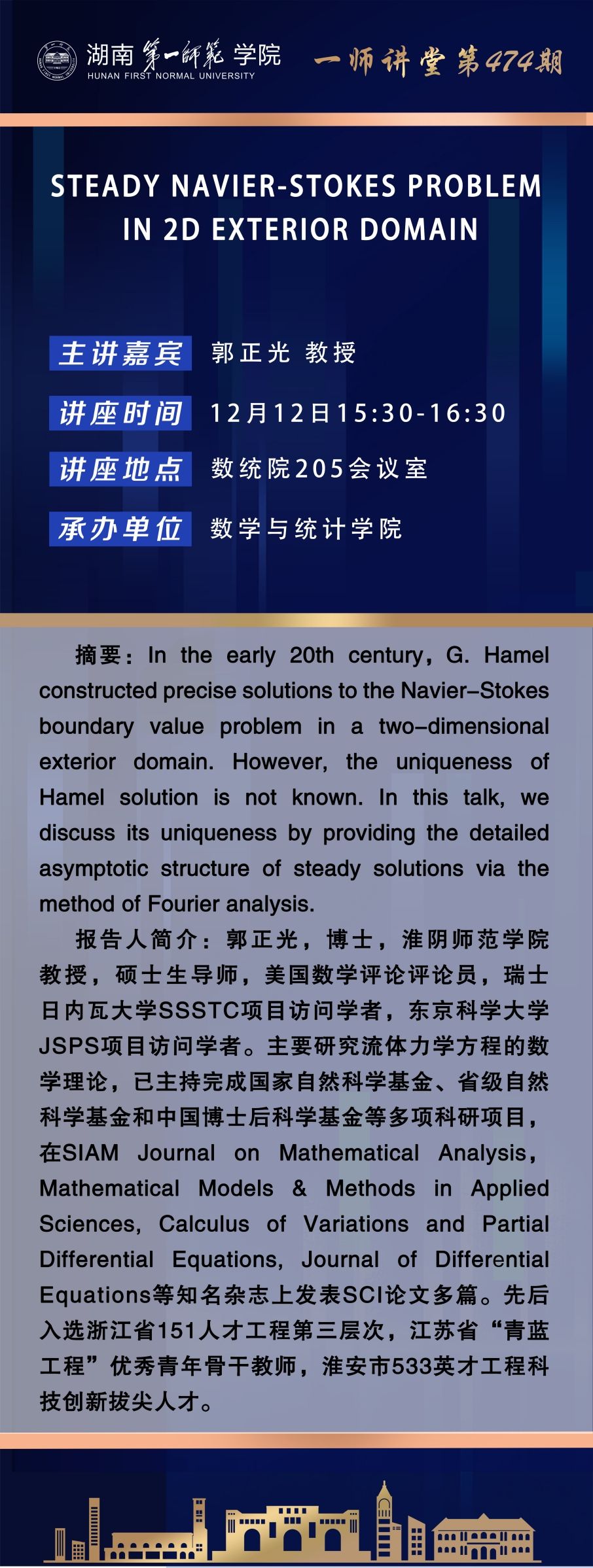 学术预告|一师讲堂第474期:STEADY NAVIER-STOKES PROBLEM IN 2D EXTERIOR DOMAIN