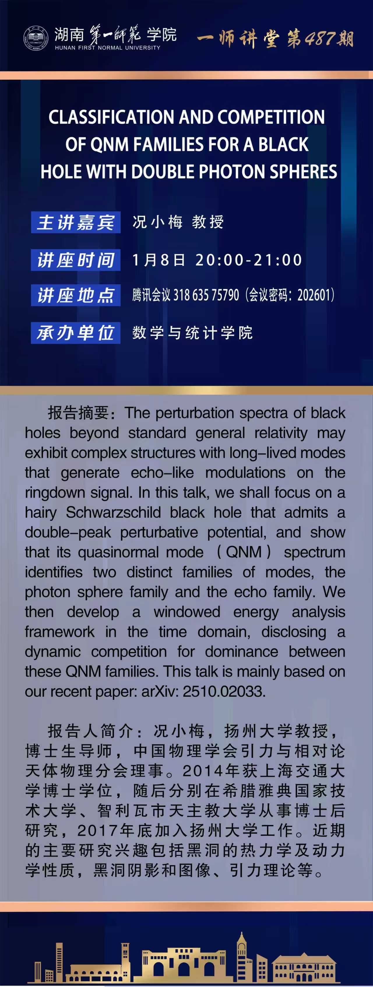 学术预告|一师讲堂第487期:CLASSIFICATION AND COMPETITION OF QNM FAMILIES FOR A BLACK HOLE WITH DOUBLE PHOTON SPHERES