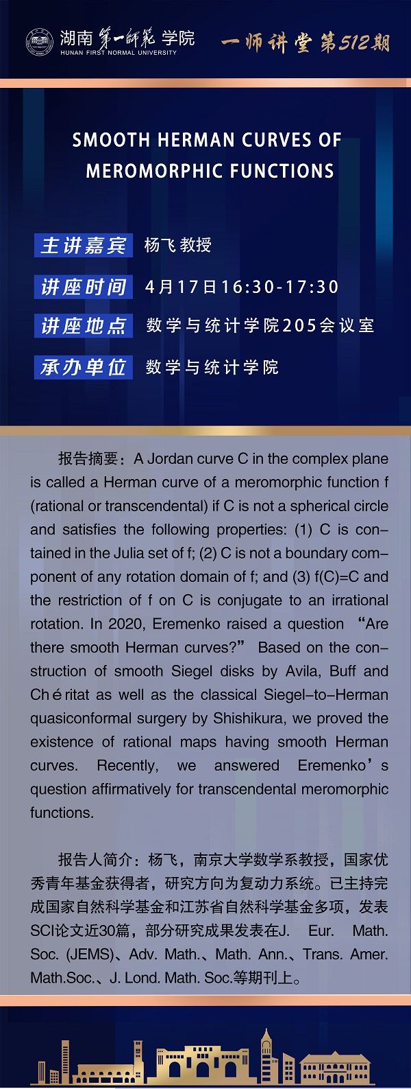 学术预告|一师讲堂第512期:SMOOTH HERMAN CURVES OF MEROMORPHIC FUNCTIONS