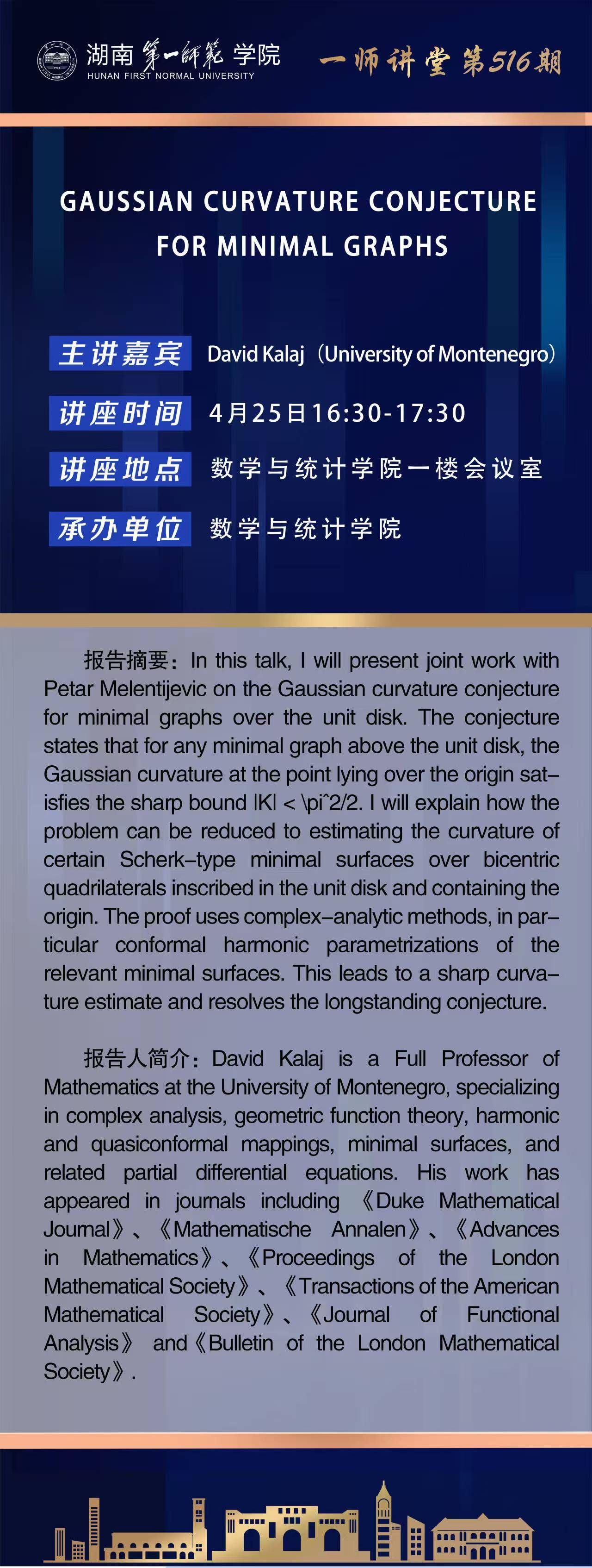 学术预告|一师讲堂第516期:GAUSSIAN CURVATURE CONJECTURE FOR MINIMAL GRAPHS
